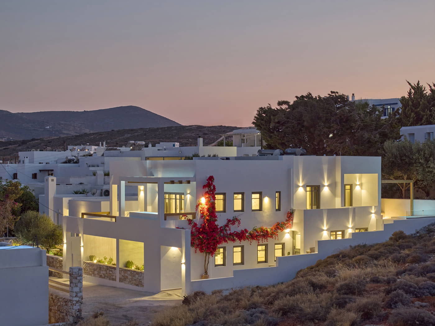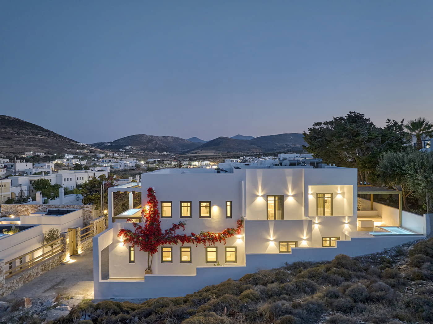 The allure of these villas isn’t just in their design but it’s also their location. Just 500 meters away lies the vibrant heart of Naousa. Here, cobbled streets wind through a tapestry of upscale restaurants, chic bars, and designer boutiques. As the sun sets, the town transforms into a haven for those with discerning tastes. Dine on fresh seafood paired with fine wine, or sip on a crafted cocktail while mingling with travelers and locals who share a love for luxury and style.